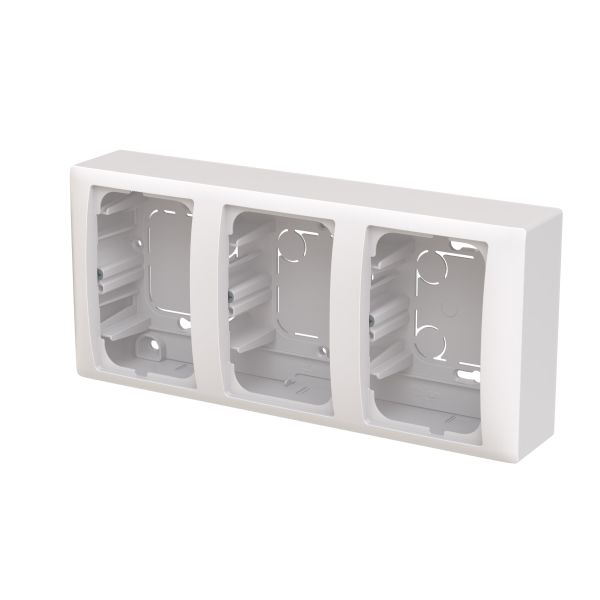 Utanpåliggande monteringsdosa SAGA 3-fack, 100 mm bred. Denna dosa är hög, med en total höjd på 48 mm. Den är lämplig för enheter med maximalt installationsdjup på 31 mm. Enheten består av bottenplatta och överdel. Biocirkulär plast används i botten- och centrumplattan.