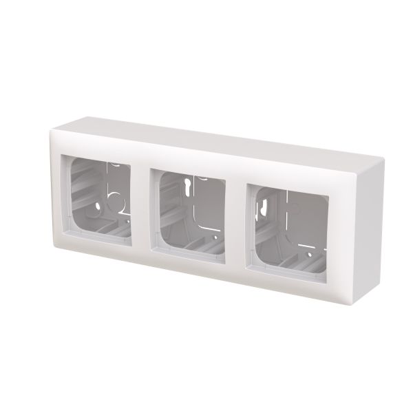 Utanpåliggande monteringsdosa SAGA 3-fack, 85 mm bred. Denna dosa är hög, med en total höjd på 53 mm. Den är lämplig för enheter med maximalt installationsdjup på 36 mm. Enheten består av bottenplatta och överdel. Biocirkulär plast används i botten- och centrumplattan.