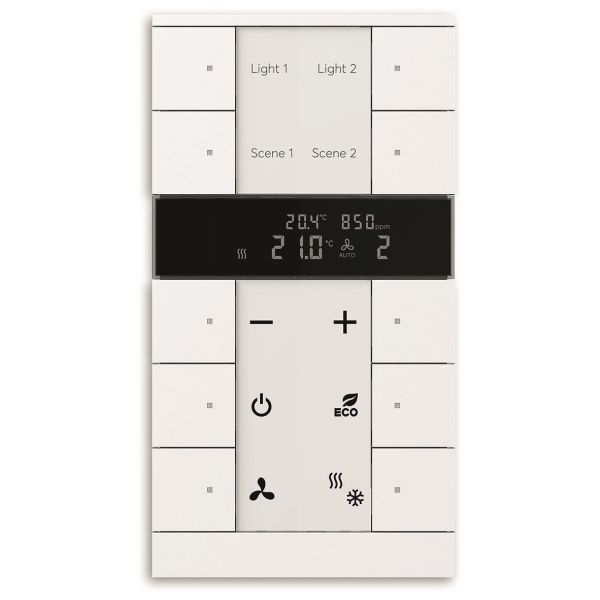 Fritt konfigurerbara multifunktions kontrollelement med RTC, CO2 samt luftfuktighetsgivare. Integrerad KNX-buss kopplare samt försett med märknings fält. Stöd för KNX-funktioner genom innovativt färg koncept (gult = belysning, blått = blind, orange = RTC, magenta = scen och vit = neutral/ingen funktion tilldelad) eller standardbelysning röd/grön. Tempsensor.