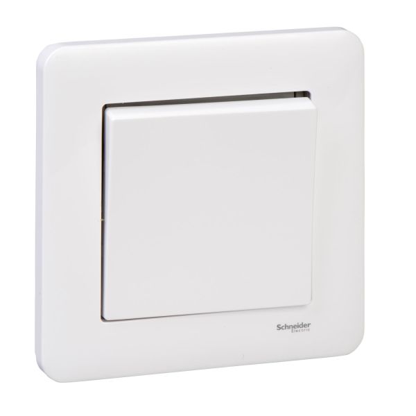 Schneider Electric vipptryckknapp med impulsfunktion är avsedd för infällt montage i apparatdosa c/c 60 mm eller för utanpåliggande montage i låg dosa 21 mm. Konstruktionen består av ett baselement med centrumplatta och en enkel tryckknapp i termoplast med blank och obehandlad yta i färgen RAL 9003. Manövrering sker med en vippa och enheten är halogenfri; den monteras med skruvmontering och ansluts via skruvklämmor. Vippan har en växlande kontakt och en pol, antalet normalt öppna och normalt stängda kontakter är båda noll, och det finns inga roterande kontakter, integrerad belysning eller signallampa. Märkspänning är 250 V och märkström 16 A, kapslingsklassen är IP21 och slagtåligheten IK03. Enhetens mått är 87 mm i bredd, 87 mm i höjd och 31 mm i djup, och minsta djup för infälld installationsdosa är 15 mm. Produkten levereras komplett i blisterpack.
