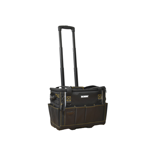 Verktygsväska tillverkad av kraftig nylon, med hjul och teleskophandtag. Totalhöjden inklusive uppfällt handtag är 1020 mm. Försedd med många invändiga och utvändiga fack och fickor samt urtagbar mellanvägg för verktyg. Levereras utan verktyg.