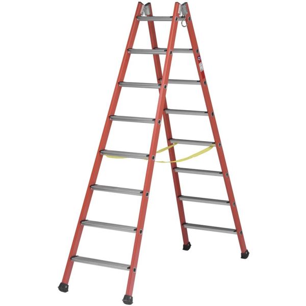 Dubbelsidig trappstege med vangstycken tillverkade i glasfiber och steg i aluminium. Stegdjup 80 mm. Testad till 30 000 volt.