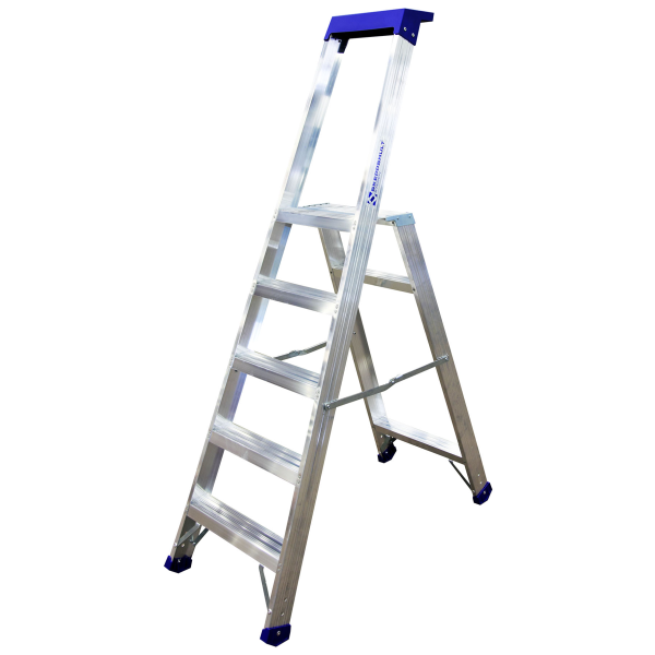 Stabil och robust trappstege i aluminium som tål tuff användning. Stegen har hydraulnitade steg, en stabil plattform samt en hylla. Plattformens mått är 375 x 250 mm och stegdjupet är 81 mm. Stegen är utrustad med fötter i plast som ger ett bra glidskydd och samtidigt skyddar underlaget.
