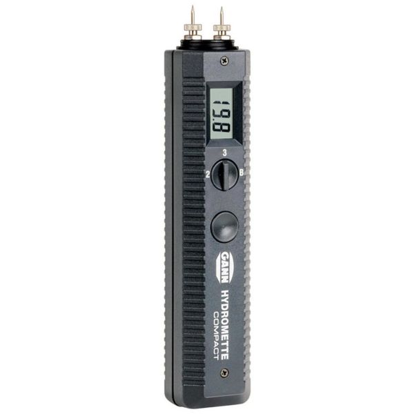Gann Hydromette Compact är en fuktmätare som mäter fuktigheten i virke, panel, foder, fönster och dörrar. Fuktmätaren är utrustad med en knapp för val av två olika kalibreringar till trä och kan användas till grupp 2 och 3 på standardlistan över träsorter. För att få en så noggrann avläsning som möjligt bör mätningen ske vid en trätemperatur på 20°C. Med knappen i position B är det även möjligt att mäta fuktigheten i gips. Hydromette Compact har mätområde från 5 till 20% i trä och från 0,3 till 3,5% i gips. Mätaren är utrustad med en elektronisk justering, som gör manuell kalibrering eller justering onödig.