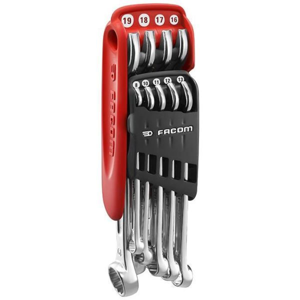 Facom 440.JP10 är en blocknyckelsats i 10 delar. Nycklarna är beständiga mot kemikalier och levereras i en smidig hållare. Mekaniska egenskaper med öppen ände NF ISO 1711 - 1.