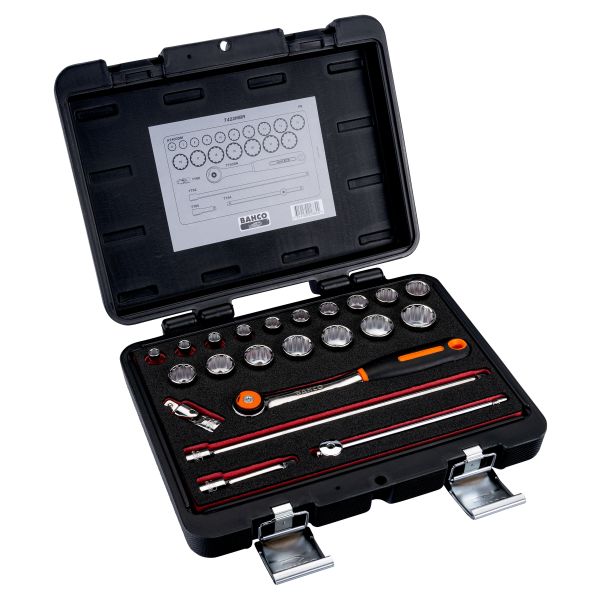 Art.nr: 40816543/8" hylsnyckelsats med fyrkantsfäste, tolvkantsprofil och spärrhandtag med runt huvud. A7400DM 3/8" metriska hylsor med fyrkantsfäste och tolvkantprofil, 6, 7, 8, 9, 10, 11, 12, 13, 14, 15, 16, 17, 18, 19, 20, 21 och 22 mm7750RN 3/8" spärrhandtag med runt huvud7760-3 och 7760-10 3/8" förlängare (75 och 250 mm)7754 3/8" T-stångshandtag7766 3/8" universalknutRäffladHögglanspoleradHögkvalitativ stållegeringStandarder: ISO 1174 och DIN 3120Hylsornas Dynamic-Drive™-profil vållar mindre slitage och skador på fästelementenHylsorna är räfflade för att göra det enkelt att skruva åt fästelement utan motstånd för handHylsorna ger maximal fördelning av moment tack vare den större anliggningsytanSpärrhandtaget har en konstruktion som förhindrar oavsiktliga riktningsbytenBekvämt spärrhandtag av tvåkomponentsmaterial som ger ett perfekt grepp med praktiskt upphängningshål