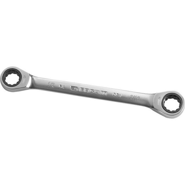 Facom 64.3/4X13/16 är en rak ringnyckel med spärrfunktion med dimensionerna 3/4" och 13/16". Omtagsvinkel på 5°.