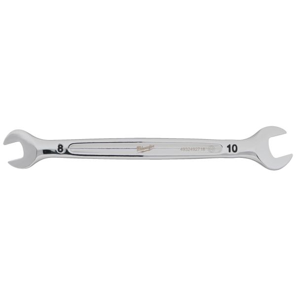 Milwaukee dubbel ringnyckel med runt l-profilhandtag och smalt huvud för bättre åtkomst. Bläckstämplade storlekar och kromfinish för rostskydd.