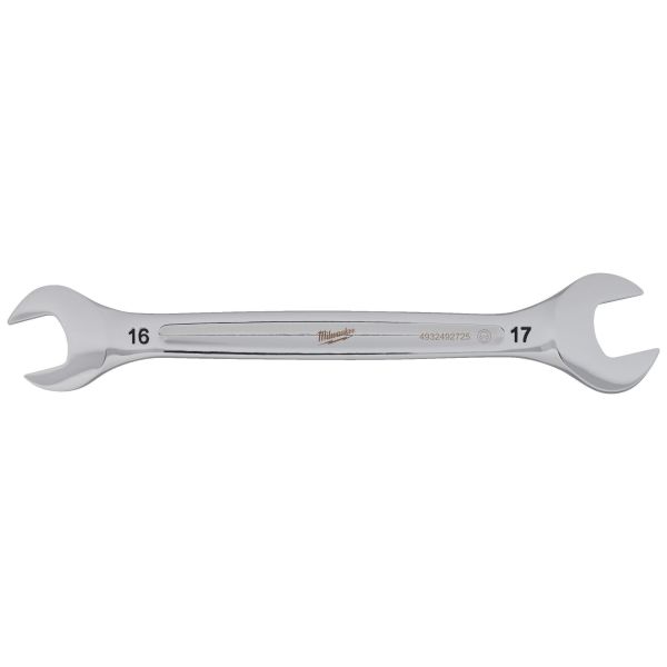Milwaukee dubbel ringnyckel med runt l-profilhandtag och smalt huvud för bättre åtkomst. Bläckstämplade storlekar och kromfinish för rostskydd.