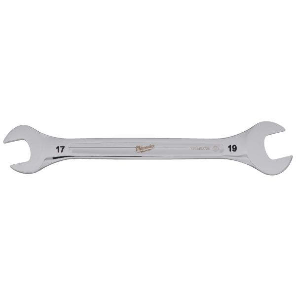 Milwaukee dubbel ringnyckel med runt l-profilhandtag och smalt huvud för bättre åtkomst. Bläckstämplade storlekar och kromfinish för rostskydd.