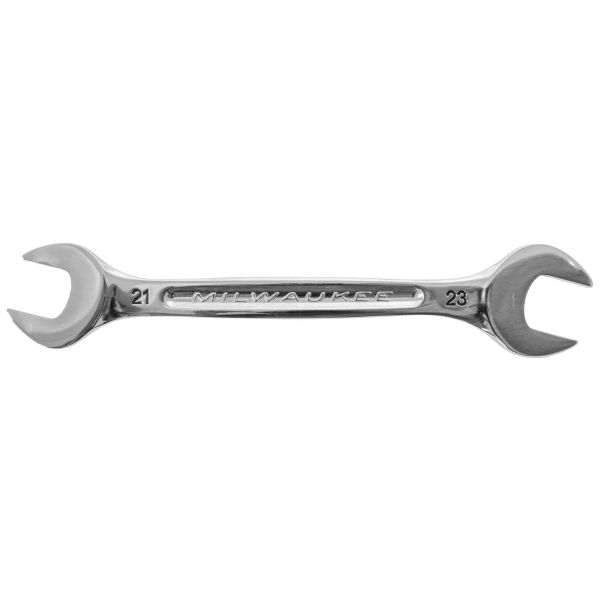 Milwaukee dubbel ringnyckel med runt l-profilhandtag och smalt huvud för bättre åtkomst. Bläckstämplade storlekar och kromfinish för rostskydd.