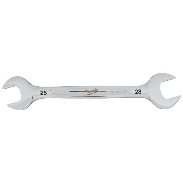 Milwaukee dubbel ringnyckel med runt l-profilhandtag och smalt huvud för bättre åtkomst. Bläckstämplade storlekar och kromfinish för rostskydd.