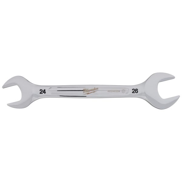 Milwaukee dubbel ringnyckel med runt l-profilhandtag och smalt huvud för bättre åtkomst. Bläckstämplade storlekar och kromfinish för rostskydd.