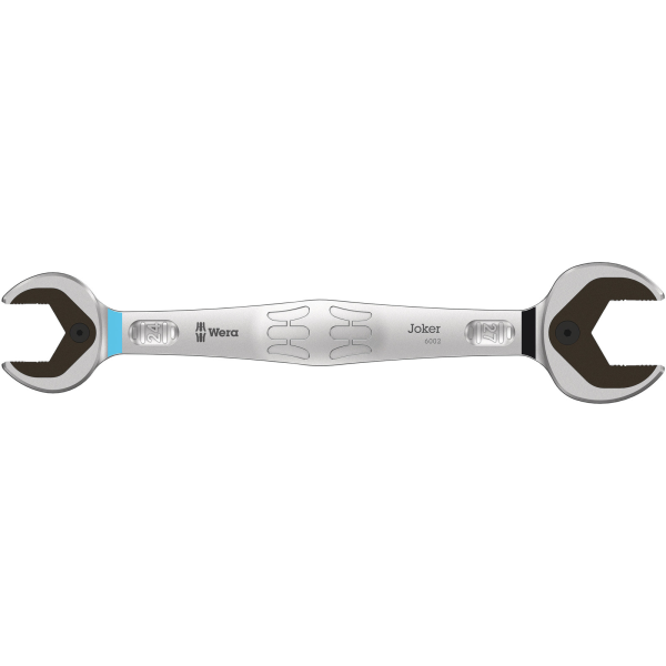 Wera Joker 6002 är en metrisk U-dubbelnyckel på 24 x 27 mm som passar för sexkantsskruvar och -muttrar. Med hållarfunktion i form av en metallplatta i U-delen, vilket minskar risken att man tappar skruvar och muttrar. Returvinkeln på bara 30° gör att man inte behöver vrida nyckeln lika ofta och den speciella smidda geometrin säkerställer hög momentöverföring och hög böjstyvhet.