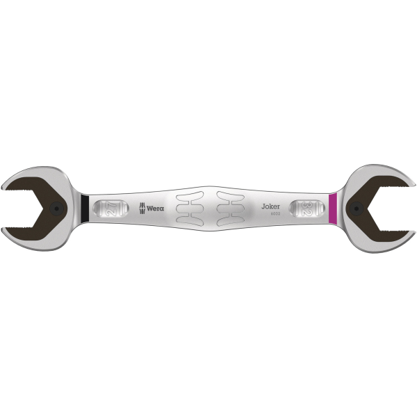 Wera Joker 6002 är en metrisk U-dubbelnyckel på 27 x 32 mm som passar för sexkantsskruvar och -muttrar. Med hållarfunktion i form av en metallplatta i U-delen, vilket minskar risken att man tappar skruvar och muttrar. Returvinkeln på bara 30° gör att man inte behöver vrida nyckeln lika ofta och den speciella smidda geometrin säkerställer hög momentöverföring och hög böjstyvhet.