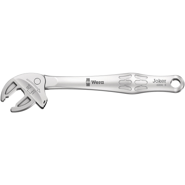 Wera Joker 6004 är en U-nyckel som med steglöst parallellt styrda käftar ersätter flera U-nyckeldimensioner. U-nyckeln greppar säkert, skadar inget och tillåter hög arbetshastighet. Dimensionen ställer in sig automatiskt när verktyget sätts på sexkantsmuttern eller skruven. Finns i olika storlekar.