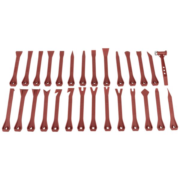 PELA 547428 är en sats i 28 delar innehållandes demonteringsverktyg för demontering av paneler, klips och trimdetaljer på fordon utan att orsaka skador. Verktygen är tillverkade av slitstark och flexibel nylon vilket skyddar ytor från repor och märken. Setet innehåller olika järn och spetsar, anpassade för specifika demonteringsbehov, såsom att lossa dörrpaneler, clips eller andra detaljer i interiör och exteriör.