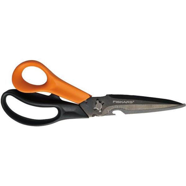 Fiskars Cuts+More Àr en multifunktionssax i rostfritt stÄl, som klipper i gren, stÄltrÄd, tyg, hÄrdplast och kartong. En mÄngsidig sax som kan delas för att anvÀndas som kniv m.m.