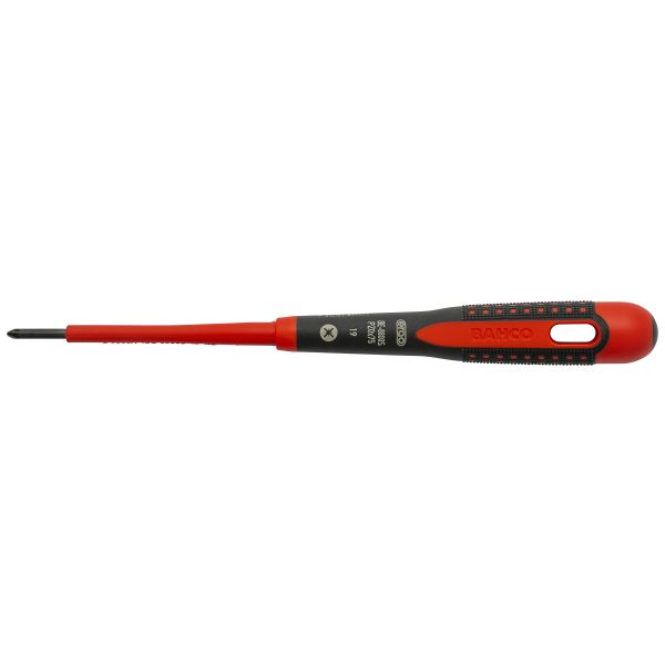Skruvmejsel utvecklad enligt den vetenskapliga ERGO-processen. ERGO VDE-isolerad skruvmejsel för Pozidriv-skruv. Testad och godkänd för arbete under spänning upp till 1 000 V. Svartoxiderad spets för bästa precision. Trekomponentshandtag för maximal komfort, bekvämt grepp i mjukt material med räfflad yta för maximal kraftöverföring. Maximal användarkomfort med minimal ansträngning tack vare den ergonomiska designen. Beständig färgmärkning i handtagets båda ändar för lätt identifiering. Ingen färgidentifiering på extra litet handtag, storlek PZ0. Plan yta för att förhindra att verktyget rullar iväg. Upphängningshål i handtaget. Högkvalitativ stållegering och isolering gjuten direkt på klingan. Individuellt kontrollerade och tillverkade i enlighet med IEC 60900, testade i vattenbad med 10 000 V. Standard: ISO 8764/DIN 5260, IEC 60900, VDE-certifierad.