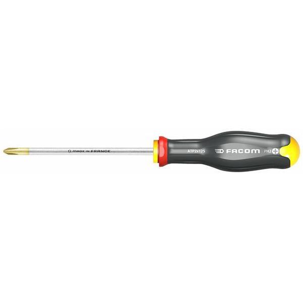 Facom ATP1X75 är en skruvmejsel med CNC-spetsbearbetning vilket ger bättre skruvpassning, ökar vridmomentöverföringen och minskar slitaget. Med mjukare handtag som är kemiskt beständig och ger bättre komfort.Bladet har "tri-coating"-behandlats med zink, nickel och krom vilket ger god korrosionsbeständighet.