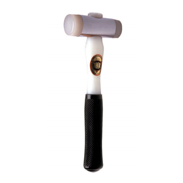 Nylonhammare med utbytbara vita nylonslag med gängad tapp. Slaghuvudet är av stål.