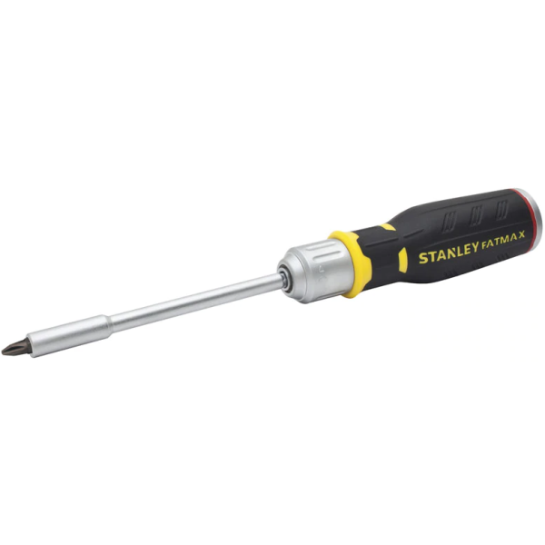 Skruvmejsel med bits, 40-tandad spärrmekanism och 9 graders vridning. Modellen har pistolgrepp för högre vridmomentbelastning och ett handtag i bimaterial för bra grepp. Bekväm bitsförvaring i handtaget.