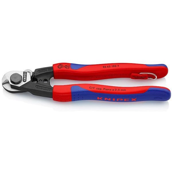 Knipex 9562190T är en 190 mm lång wiresax med fästögla för fallskydd och en skärgeometri som förhindrar uppsplitsning av wiren.