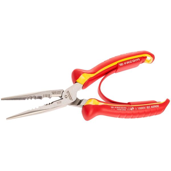 Facom 183AE.20VE Spetstång. Trådgrepp- och matningsspår för 1,5 mm2, 2 mm2 & 4 mm2 isolerad koppartråd. Ergonomiska halkskydd. Finish: polerad, lackad. För arbeten i närheten av spänningsförande delar upp till 1 000 V AC.