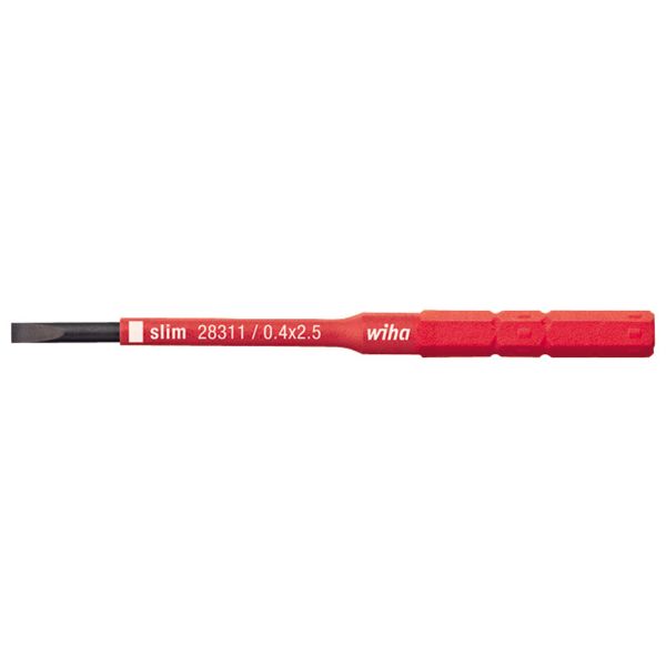 Wiha slimBit (spår) med en längd på 75 mm och 6 mm:s fäste, för arbeten i närheten av spänningsförande delar upp till 1000V AC. Ska endast användas i bitshållaren slimVario samt slimTorque VDE. Hos Wiha slimTECHNOLOGY, som utvecklats speciellt för elarbeten, integrerades skyddsisoleringen i klingan för att möjliggöra upp till 33 % smalare klingor. På så sätt kan även djupliggande skruv- och fjäderelement nås med slimBit utan problem. De isolerade slimBit-bitsen genomgår en styckkontroll enligt den internationella standarden IEC 60900 och gör det möjligt att arbeta säkert i närheten av spänningsförande delar upp till 1 000 V AC.