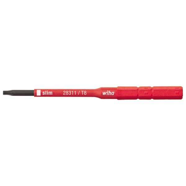 Wiha Torx slimBit med en längd på 75 mm och 6 mm:s fäste, för arbeten i närheten av spänningsförande delar upp till 1000V AC. Ska endast användas i bitshållaren slimVario samt slimTorque VDE. Hos Wiha slimTECHNOLOGY, som utvecklats speciellt för elarbeten, integrerades skyddsisoleringen i klingan för att möjliggöra upp till 33 % smalare klingor. På så sätt kan även djupliggande skruv- och fjäderelement nås med slimBit utan problem. De isolerade slimBit-bitsen genomgår en styckkontroll enligt den internationella standarden IEC 60900 och gör det möjligt att arbeta säkert i närheten av spänningsförande delar upp till 1 000 V AC.