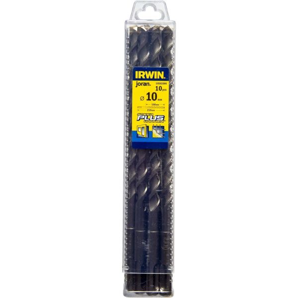 Speedhammer Plus-borr från Irwin som har en diameter på 10 mm och är konstruerad för borrning i betong, murverk, tegel, block och granit. Den nya och innovativa spiraldesignen med 28 % större spiralkapacitet säkerställer en extra snabb och komfortabel borrning. Tar snabbt bort borrkax och borrdamm. Tack vare spiralen som gör att borrdammet inte stockar sig, fungerar borren optimalt i betong som inte är helt härdad. Levereras i 10-pack.