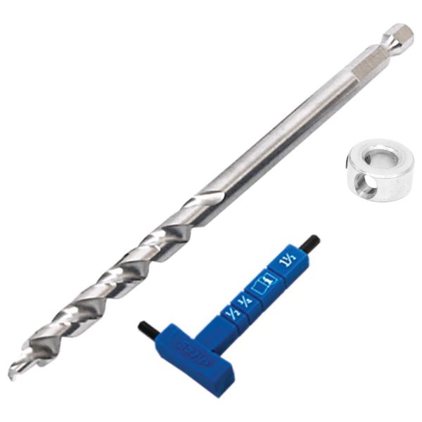 Easy-Set Micro-Pocket borr med djupanslag och materialtjockleksmätare med insexnyckel är konstruerad för användning med Micro-Pocket borrstyrsats för att skapa 25 procent mindre hål med Pocket-Hole Jigs i 500-serien och 700-serien. För användning med Micro-Pocket borrstyrsatser KPHA530 och KPHA730.