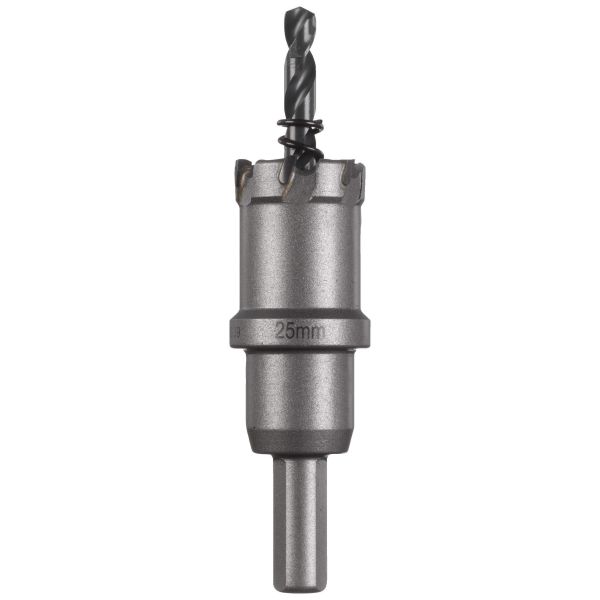 TCT hålsåg till metall från Milwaukee. Karbidtandteknologi ger bästa prestanda, hastighet och lång livslängd. Hela 25 mm borrdjup i plåtmaterial och rör. Den har en solid hålsågsdesign som minskar vibrationer och ger en nogrann borrning. Borrstopp förebygger överborrning. Utstötarfjäder skjuter ut pluggen vilket sparar tid. Med säkert 3-sidigt fäste som förebygger att hålsågen slinter i chucken vilket säkrar maximalt vridmoment. Diameter 16-76 mm med 10 mm och > 80 mm med 13 mm 3-sidigt fäste. Utbytbar pilotborr och fjäder. Använd ett kylande smörjmedel för att förlänga hålsågens livslängd. Till metaller används skärolja, aluminiumterpentin, plastvatten. Torrborra i gjutjärn. Lämplig för borrning i stål (<1200 N/mm²) upp till 4 mm, rostfritt stål upp till 2 mm, aluminium, zink, gjutjärn, koppar, glasfiber och PVC.