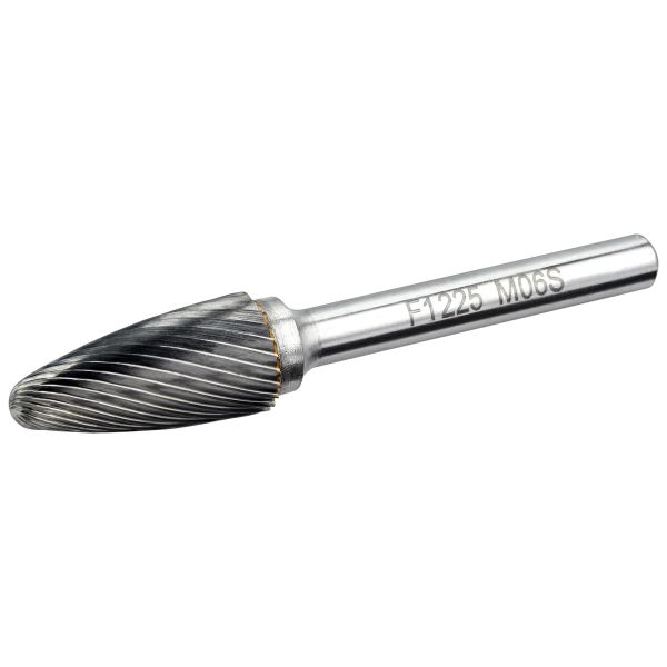 Roterande fil med spetsad form och rundad topp. För avgradnings- och formbearbetning. Mediumtandad med spånbrytare och tillverkad i hårdmetall.