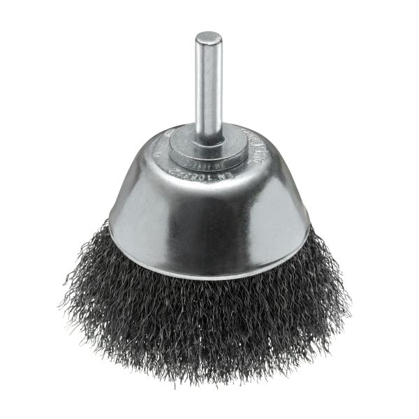 Med krusad tråd för lättare rengöringsarbeten och ytbehandlingar. Den är också lämplig för borttagning av beläggningar och rost samt rengöring av ytskikt. Med 6 mm tapp för fastsättning i t.ex. borrmaskin. Krusad ståltråd.