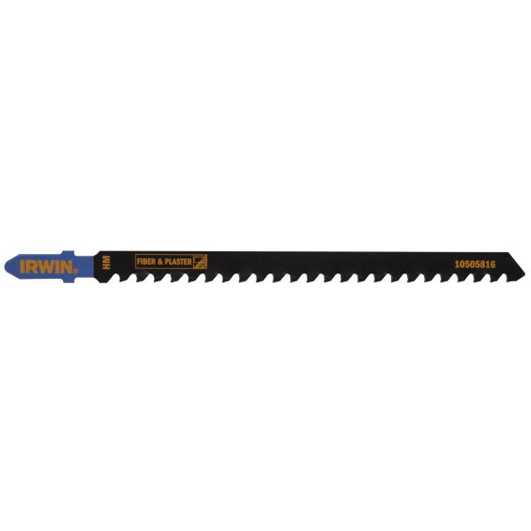 Sticksågsblad från Irwin på 100 mm med T-fäste och 6 TPI för skärning av glasfiber och gips. Bladet har även hårdmetallspetsar för lång livslängd, särskilt vid sågning i material med slipverkan.