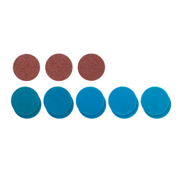Komplett slipskiveset för effektiv slipning i flera steg. Innehåller 3 st 50 mm slipskivor (K60, K80, K120), 10 st 50 mm slippapper utan skruvfäste (2 x K400, 2 x K800, 2 x K1200, 2 x K1500, 2 x K2000) samt 1 st Roll Lock-platta.