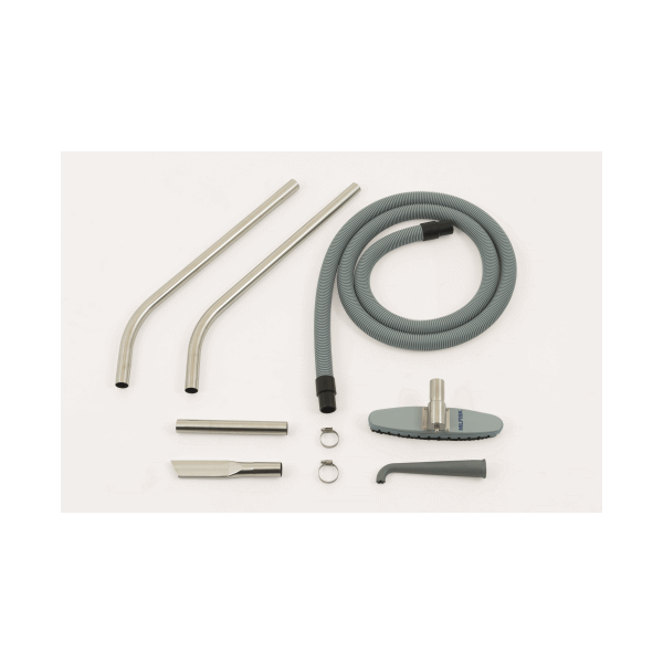 Kitet innehåller en 3 meter lång antistatisk plastslang med muffar, två rostfria stålrör för förlängning/handtag, ett 300 mm brett antistatiskt golvmunstycke, samt platta och koniska ledande fogmunstycken i rostfritt stål. Alla metallkomponenter är tillverkade i AISI 316‑klassat rostfritt stål, vilket ger hög hållbarhet och motståndskraft mot korrosion. Dessa komponenter säkerställer effektiv rengöring och minimerar risken för skador på känslig utrustning eller material.