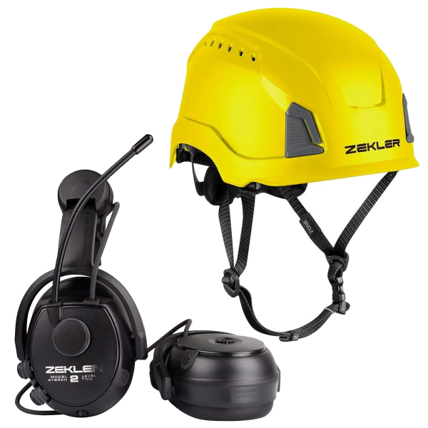 Hörselskyddspaket från Zekler som består av hörselkåpan 412RDH med hjälmfäste och nivåberoende medhörning samt skyddshjälm Zone Mips med en gul färg. Zekler 412RDH är ett bekvämt hörselskydd för hjälmmontage med inbyggd FM-stereoradio och nivåberoende medhörning. Mikrofonerna på hörselkåpans framsida fångar upp ljud från omgivningen, vilket gör det möjligt för dig att vara medveten om din omgivning och underlätta kommunikationen med dina kollegor. Om ljudet når skadliga nivåer reagerar elektroniken snabbt och minskar ljudnivån till maximalt 82 dB(A).