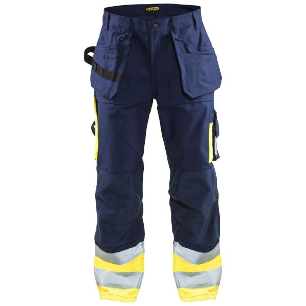 Varselbyxa med CORDURA®-förstärkningar på knän för extra slitstyrka, hammarhank i sidan, breda hällor, hällor, varav en med D-ring, ID-kortsficka, bakfickor med bälg, benficka med pennficka, extra ficka och telefonficka. Framfickor med bälg, knäskyddsfickor anpassade för Blåkläders samtliga knäskydd, spikfickor - med mejselfickor och verktygshankar som kan stoppas i de bälgade framfickorna. Tumstocksficka med knivhållare och pennficka. Certifierad enligt EN ISO 20471/EN 20471, klass 1 skyddskläder med hög synbarhet och EN 14404 tillsammans med EN 14404-certifierade knäskydd, art: 4018, 4000, 4008. Material: 65% polyester, 35% bomull, twill, 300 g/m².