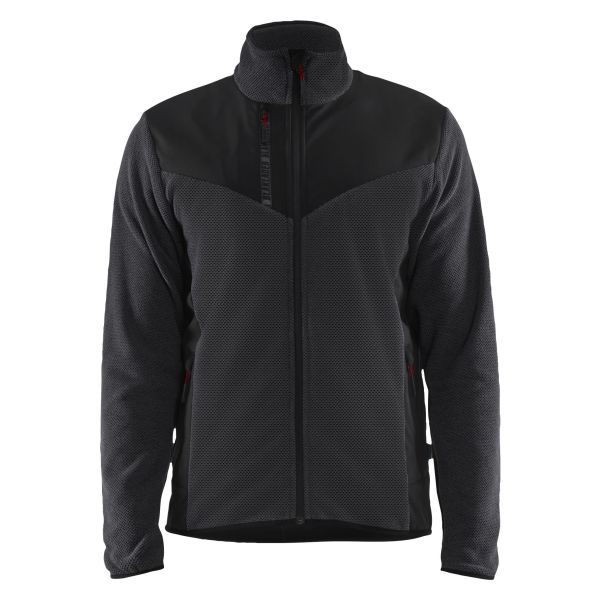 Stickad jacka med krage i snygg design och oslagbart bekväm fleecekvalitet. Denna jacka har ett unikt material som bäst kan beskrivas som tredimensionell fleece. Det borstade materialet ger jackan dess utseende med 3D-mönster, stretchig och smidig bekvämlighet samt värme när det behövs som mest. För ökad slitstyrka finns det förstärkande softshellpaneler på jackans utsatta områden, och då det inte finns någon softshell i armhålorna är ventilationen förbättrad. Har utmärkta profileringsytor, men passar lika bra i arbetet som på fritiden. Finns även som dammodell 5943.