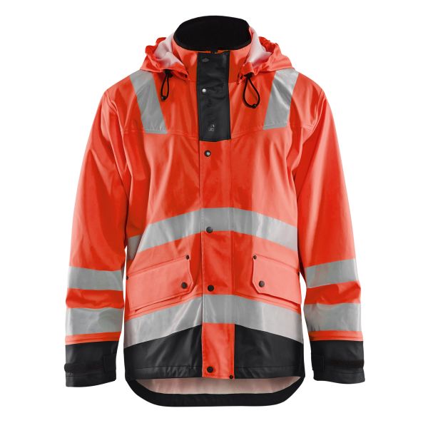 Regnjacka i varsel för dig med arbetsuppgifter som kräver ett slitstarkt men samtidigt rörligt regnplagg. Den är vind- och vattentät med svetsade sömmar och har ventilation i rygg. Jackan har avtagbar, justerbar luva, mjuk fleecefodrad krage. Den är försedd med lättåtkomliga fickor såsom avtagbar ID-kortsficka, framfickor med lock och tryckknapp samt napoelonficka innanför fronstlå. Dolt kraftigt tvåvägsblixtlås med dragkedja ända upp i kragen, frontslå med tryckknappar samt stormknäppning som håller vätan borta. Bra passform med justerbar nederkant och dragsko samt justerbart ärmavslut med velcro och invändig neoprenmudd som håller kroppsvärmen trots väta. Certifierad enligt EN 343, skyddskläder mot dåligt väder och EN ISO 20471, klass 3, skyddskläder med hög synbarhet. Färg 4600, 9900 är ej certifierade enligt EN ISO 20471. Färg 4600, 5300 samt 9900 har uppdaterats. Äldre modell levereras ut så långt lagret räcker. För uppdaterad modell i färg 4600, 9900, se artikel 4305.