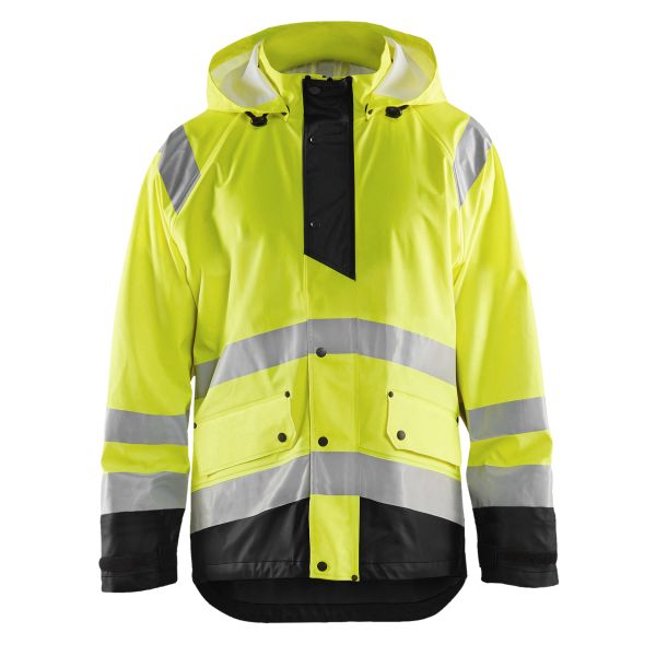 Den här lätta regnjackan ger dig hög visibilitet på arbetsplatsen när blött väder och dålig sikt kan göra arbetsförhållandena besvärliga. Materialet är starkt och tåligt trots sin lätthet samt vind- och vattentätt med svetsade sömmar. Jackan har förlängd rygg och justerbar nederkant samt lättåtkomliga framfickor med lock och ärmavsluten med velcro. Certifierad enligt EN 343, skyddskläder mot dåligt väder och EN ISO 20471, klass 3, skyddskläder med hög synbarhet.