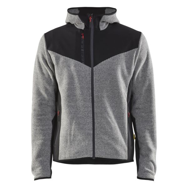 Stickad jacka med luva i snygg design och oslagbart bekväm fleecekvalitet. Denna jacka har ett nytt, unikt material som bäst kan beskrivas som tredimensionell fleece. Det borstade materialet ger jackan dess utseende med 3D-mönster, stretchig och smidig bekvämlighet samt värme när det behövs som mest. För ökad slitstyrka finns det förstärkande softshellpaneler på jackans utsatta områden, och då det inte finns någon softshell i armhålorna är ventilationen förbättrad. 5940 har utmärkta profileringsytor, men passar lika bra i arbetet som på fritiden. Envägsblixtlås i plast, Invändig slå.Bröstficka med blixtlås Framfickor med blixtlås. Förlängt ryggslut, Elastiskt band i nederkant. Ärmavslut med elastiskt band. Material: 97% polyester, 3% elastan, Jacquard stickning, borstad baksid, stretch, 290 g/m2. Tvättråd: 40 °C.