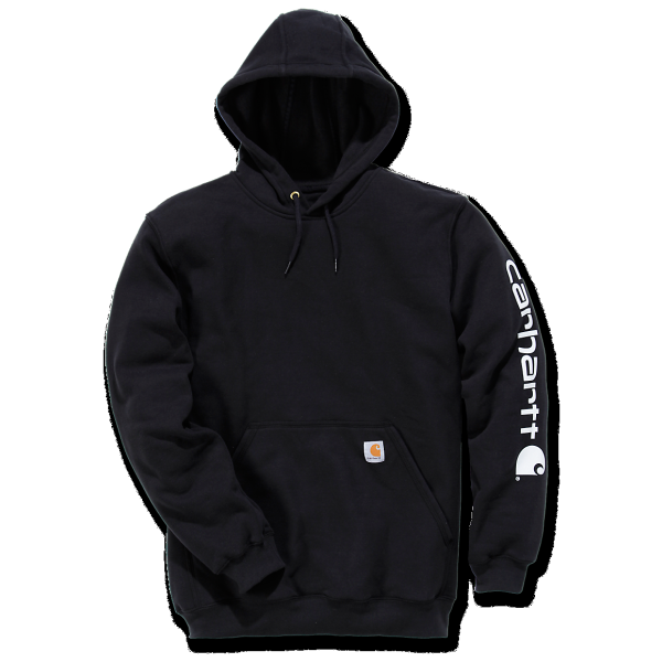 Carhartts signaturlogga är tryckt längs vänster ärm för en autentisk look, och den klassiska loggan är även snyggt fastsydd på fickan. Perfekt för arbete, fritid och alla tillfällen där du vill ha en skön och pålitlig huvtröja.