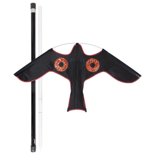 Art.nr: 2570038En fågelskrämma som avskräcker fåglar, exempelvis kråkor, kajor, måsar och duvor. Är fäst i en lina som går till den 5 meter långa masten. Används på öppna ytor som fält, odlingar, byggnader, småbåtshamnar och liknande.