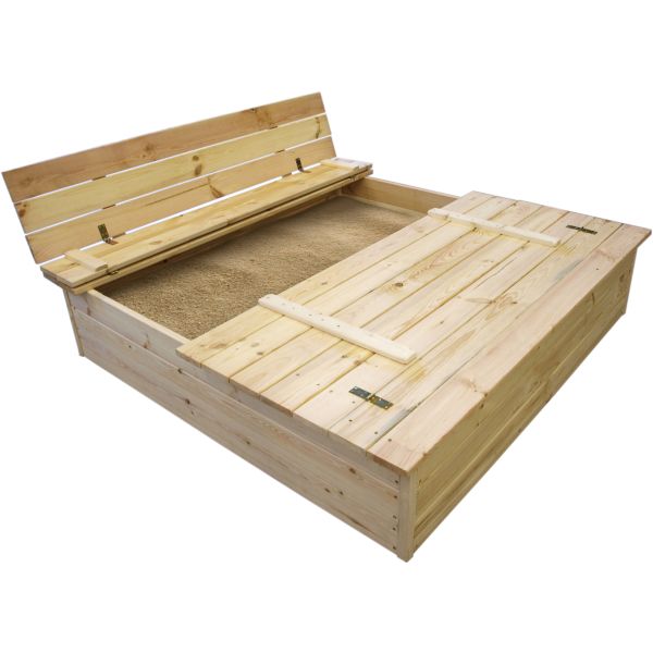 Sandlåda som har måtten 140x140 cm med ett lock som går att fällas upp till en bänk. Sandlådan är FSC-certifierad för ett ansvarsfullt skogsbruk. Säkert för barn.