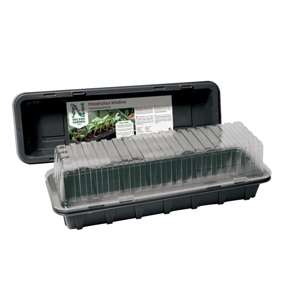 Minidrivhus som med fördel placeras på fönsterbrädan. Drivhuset kan användas till krukor, t.ex. 4 stycken 6-celliga krukinsatser. Mått: 47 x 16 cm.
