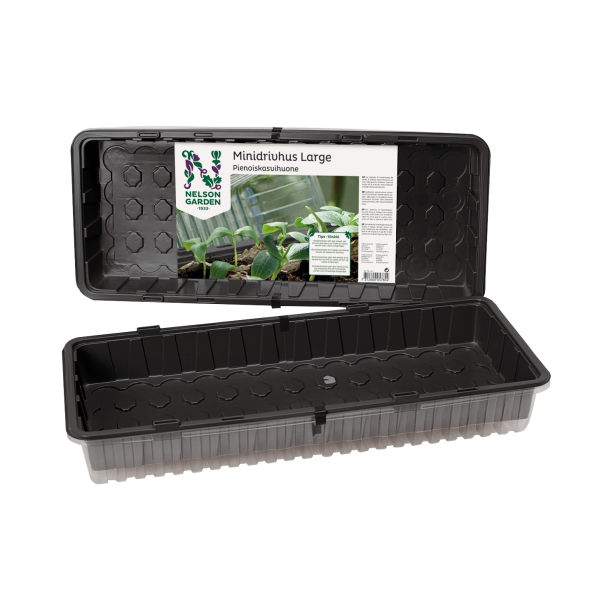 Art.nr: 4079768Stort och stabilt minidrivhus med fördjupningar i botten som passar till 48 torvbriketter. Drivhuset kan även användas till krukor, t.