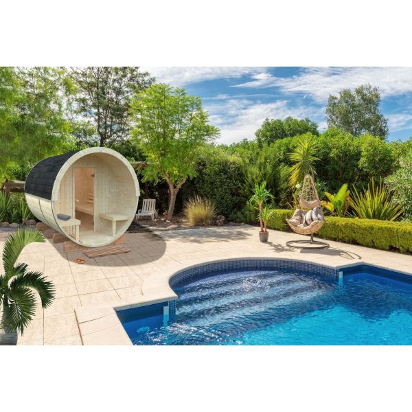 Svart takshingel ingår i setet. Ångrummets glasdörr har ett 8 mm härdat glas.